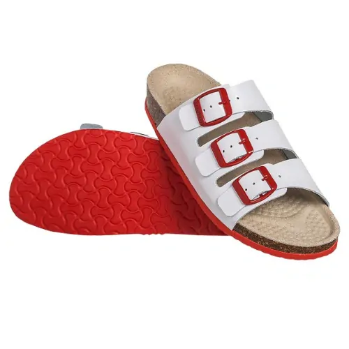 Obuv s korkovo-gumovou vložkou. úplný ortopedický profil kožený svršek potažený zátěrem, který usnadňuje mytí a dezinfekci šířka nastavitelná díky třem popruhům s přezkami dno s protiskluzovým vzorem sametová kožená podšívka splňují požadavky normy EN20347 Velikost Délka stélky d... celý popis