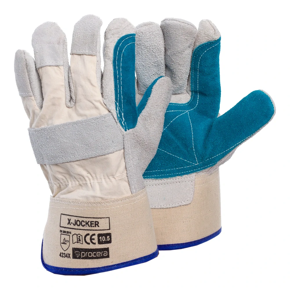 Minimální odběr 12 párů. Pětiprsté rukavice X-JOCKER s celou dlaní, vyrobené z bavlněné tkaniny na hřbetu. Rukojeť je vyrobena z vysoce kvalitní hovězí štípané kůže v přírodní barvě. Rukojeť, ukazováček a palec jsou dodatečně vyztuženy vrstvou modré hovězí štípané kůže. Hřbet, metakarpální linie a konečky prstů jsou také vyztuženy štípanou kůží. Manžeta je pogumovaná a zakončená lemem, nad kterým je všitá stahovací šňůrka pro pohodlí a snadné použití. Vnitřek rukojeti je zakončen měkkou podšívkou. Kategorie II. K dispozici ve velikosti 10,5.
