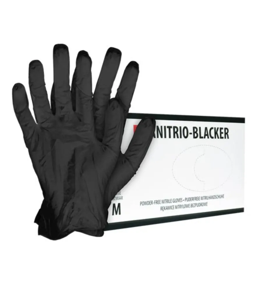 Černé nitrilové rukavice - bez pudru. sedí na pravou i levou ruku texturovaná na vnější části ruky a prstů, která zabraňuje sklouznutí předmětů a usnadňuje uchopení a zároveň zajišťuje velmi dobrý pocit a obratnost perfektní mimo jiné pro tetování, kosmetiku, kadeřnictví a autolakovny baleno po 100... celý popis
